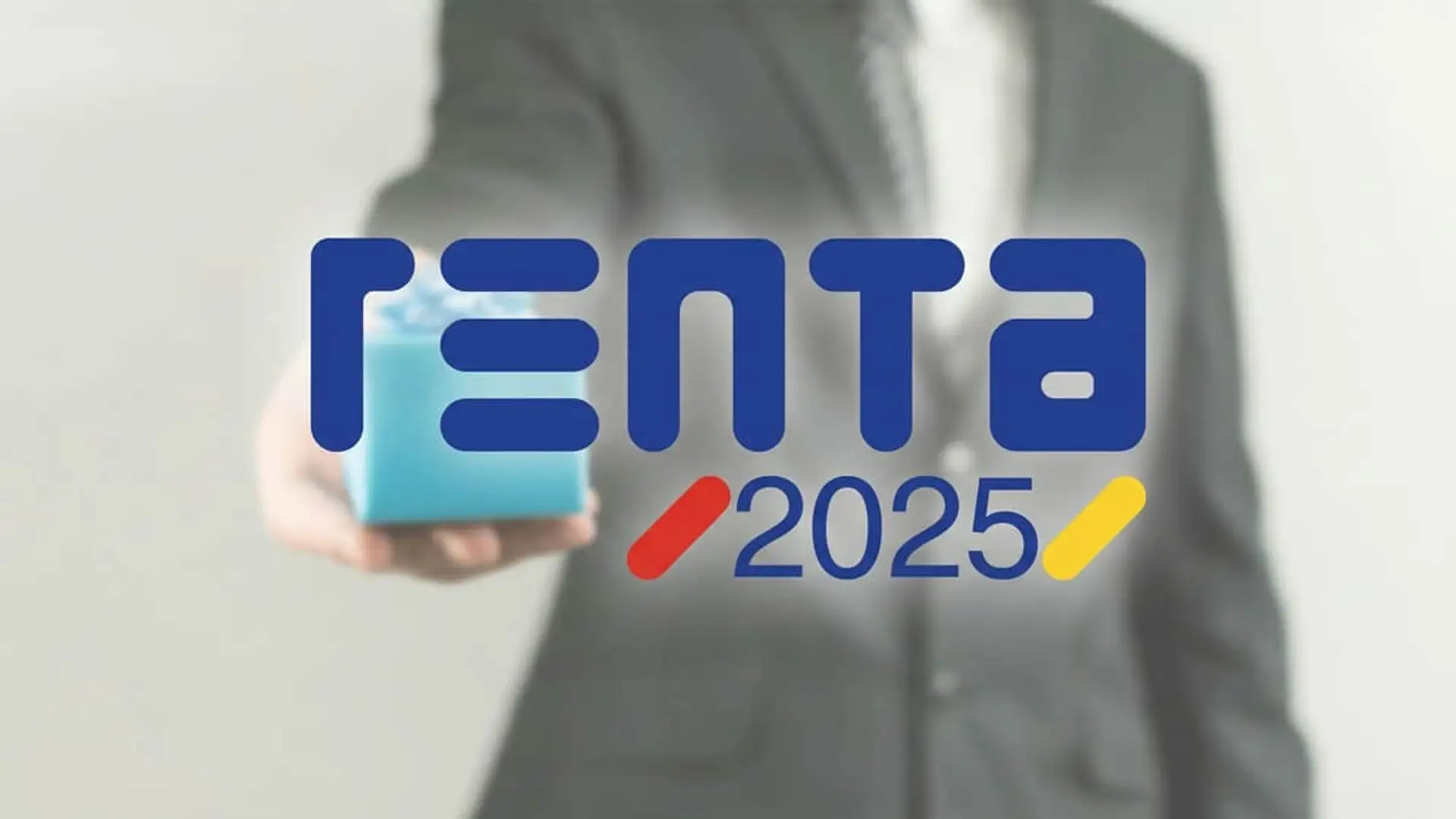 Logotipo de la Renta 2025 con un hombre en traje entregando un regalo para representar la tributación de incentivos bancarios.